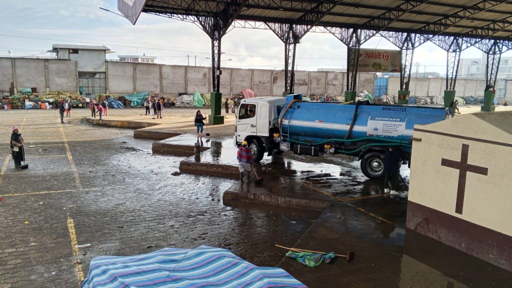 Las cuadrillas de mantenimiento, junto al personal administrativo, intervinieron las naves de comercialización. Las labores incluyeron barrido y remoción de escombros, limpieza exhaustiva de pasillos y áreas de circulación vehicular para facilitar el tránsito, además de la reubicación de elementos de señalización y adoquines para mejorar la seguridad peatonal. Las áreas de carga también fueron supervisadas asegurando que los productos se mantengan protegidos bajo condiciones óptimas de higiene.